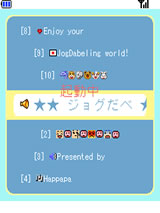 ジョグだべ(アプリ) -> ジョグだべって何?「ジョグだべ」は、携帯電話で動作するJavaアプリケーションです。携帯電話で再生できる音声データといえば、いわゆる着信系のボイスデータなどがダウンロード/登録できますが、その利用シーンやデータは文字通り、"電話やメールなどの着信時"が想定されていました。 ジョグだべは、自分の好みで登録しておいた短いセンテンスや決めセリフ、効果音などをジョグダイヤル表示から選択、あるいは数字キーによるショートカットで、連続再生することができます。 たとえば、